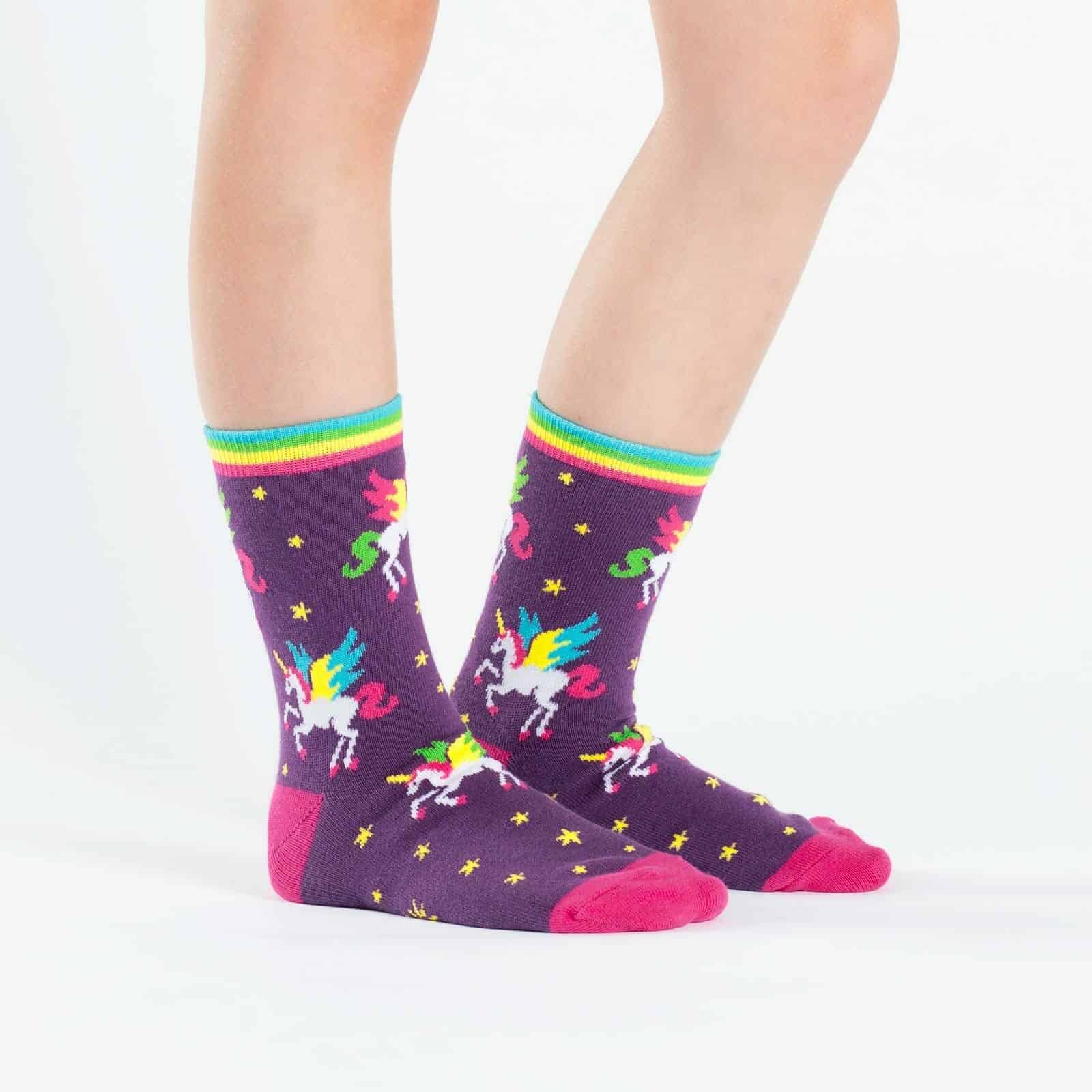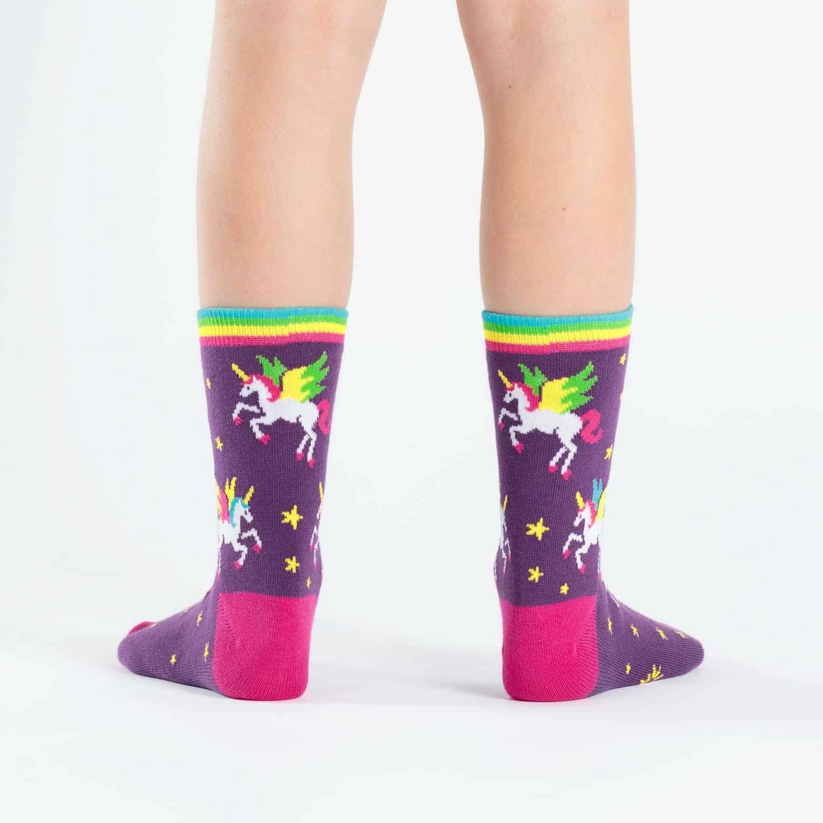 Att bära våra lila barnstrumpor Winging It är detsamma som att du skulle ha dina favorit-klistermärken i regnbågens alla färger, på fötterna. Om det hade varit luktisar(förutsatt att dina fötter är rena) tror vi de hade luktat "magi".